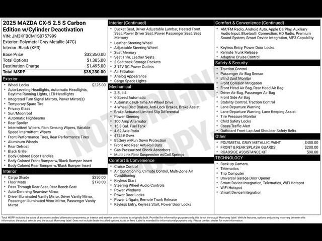 Polymetal Gray Metallic 2025 Mazda CX-5 2.5 S Carbon Edition AWD 6-Speed Automatic SKYACTIV® 2.5L 4-Cylinder DOHC 16V