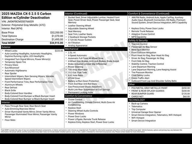 Polymetal Gray Metallic 2025 Mazda CX-5 2.5 S Carbon Edition AWD 6-Speed Automatic SKYACTIV® 2.5L 4-Cylinder DOHC 16V
