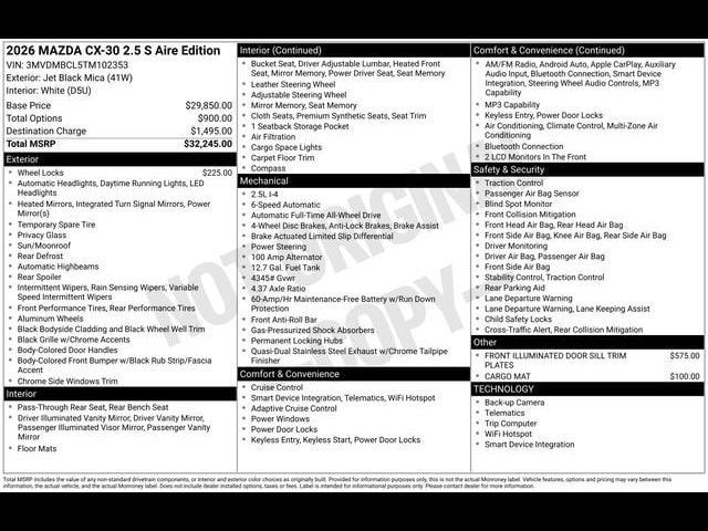 Jet Black Mica 2026 Mazda CX-30 2.5 S Aire Edition AWD 6-Speed Automatic SKYACTIV® 2.5L 4-Cylinder DOHC 16V