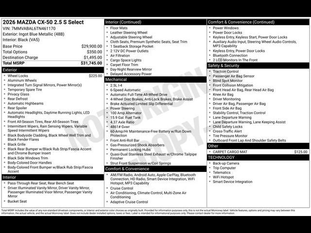 ingot blue metallic 2026 Mazda CX-50 2.5 S AWD 6-Speed Automatic 2.5L 4-Cylinder DOHC 16V