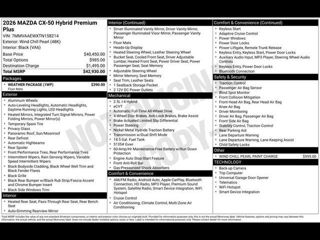 Wind Chill Pearl 2026 Mazda CX-50 Hybrid Premium Plus AWD CVT 2.5L 4-Cylinder 2.5L 4-Cylinder.