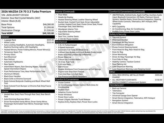Soul Red Crystal Metallic 2026 Mazda CX-70 3.3 Turbo Premium AWD 8-Speed Automatic I6 Turbo