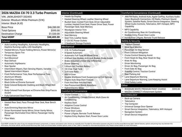 Rhodium White Premium 2026 Mazda CX-70 3.3 Turbo Premium AWD 8-Speed Automatic I6 Turbo