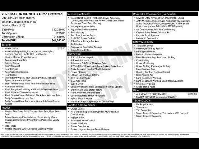 Jet Black Mica 2026 Mazda CX-70 3.3 Turbo Preferred AWD 8-Speed Automatic I6 Turbo