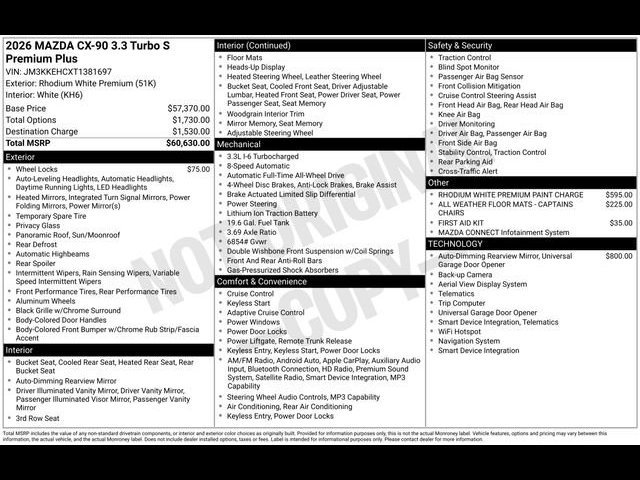 Rhodium White Premium 2026 Mazda CX-90 3.3 Turbo S Premium Plus AWD 8-Speed Automatic I6