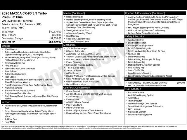 Artisan Red Premium 2026 Mazda CX-90 3.3 Turbo Premium Plus AWD 8-Speed Automatic I6 Turbo