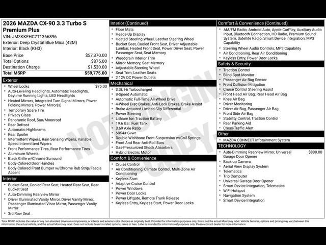 Deep Crystal Blue Mica 2026 Mazda CX-90 3.3 Turbo S Premium Plus AWD 8-Speed Automatic I6 Turbo