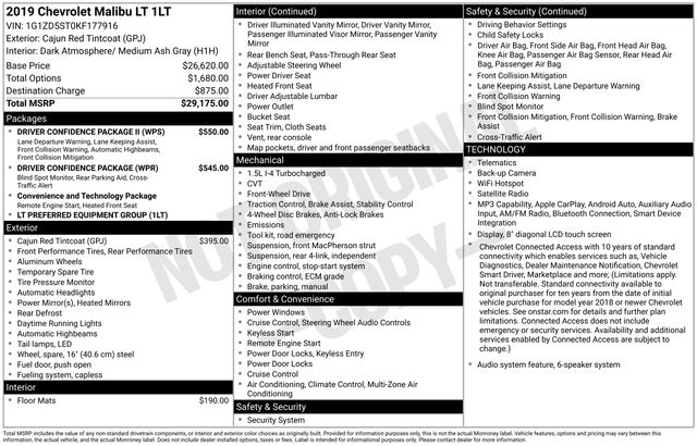 Clean CARFAX. Cajun Red Tintcoat 2019 Chevrolet Malibu LT FWD CVT 1.5L DOHC Fully Detailed, Dark Atmosphere/ Medium Ash Gray Cloth.